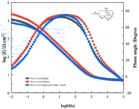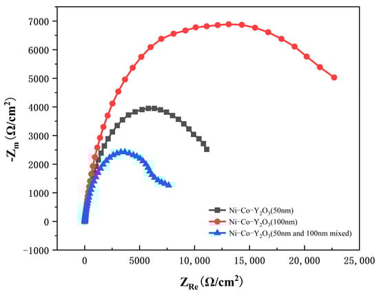 Figure 12 presents the Nyquist plots of the three coatings. As shown in the diagram, the Ni-Co-Y2O3 (100 nm) coating exhibits a high charge transfer resistance, indicating that the electron transfer between the coating and the corrosive medium is significantly hindered, thereby effectively suppressing the corrosion reaction. This suggests that the Ni-Co-Y2O3 (100 nm) coating can efficiently prevent the electrochemical interaction between ions in the corrosive medium and the metallic components of the coating, thus enhancing its corrosion resistance. In contrast, the Ni-Co-Y2O3 (50 nm and 100 nm mixed) coating shows a lower charge transfer resistance in the Nyquist plot. During the corrosion process, electrons are more readily transferred between the coating and the corrosive medium, facilitating the corrosion reaction and resulting in relatively weaker corrosion resistance. When 50 nm and 100 nm Y2O3 particles are combined to prepare the coating, the significant difference in particle size makes it difficult to form a uniform microstructure during deposition. In a corrosive environment, the aggressive medium is more likely to penetrate through these non-uniform interfaces and structural defects, reaching the substrate surface and initiating a corrosion reaction.