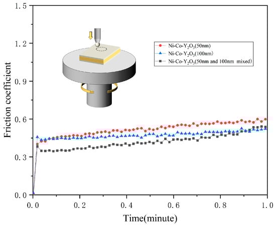 Figure 14 shows the friction and wear diagram of the three composite coatings. As shown in Figure 14, when the 50 nm and 100 nm Y2O3 particles are mixed, the prepared coating has a smaller friction coefficient. On the one hand, the surface microstructure is optimized. Small particles fill the gap of large particles to make the surface smoother and reduce the occlusion of surface protrusions during friction. As the strengthening phase, Y2O3 particles with different particle sizes work together to form a more effective strengthening network inside the coating. The larger particles provide a larger support skeleton, while the smaller particles hinder the movement of dislocations, making it more difficult for the coating material to deform plastically. At the same time, the particles with different particle sizes are evenly distributed in the Ni-Co matrix and support each other to form a denser structure. As a strengthening phase, the microstructure is refined and the dislocation movement is hindered by the synergistic effect, which makes the coating more difficult to deform and have higher hardness.