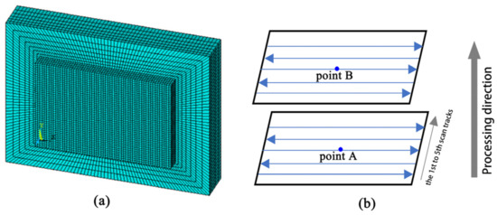 Finite element model of Al2O3/CoCr metal matrix composite SLM forming specimen: (a) finite element model, (b) scanning strategy.