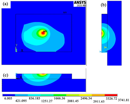 As the laser moves to the second layer, the solidified region continues to expand. Through the continuous balance between heat accumulation and dissipation, the molten pool gradually stabilizes. Figure 4 illustrates the temperature distribution within the molten pool at different cross-sections when the laser (operating at a power P = 200 W and scanning speed V = 700 mm/s) moves to point B (the center of the second layer). Figure 4a depicts the cross-sectional morphology of the molten pool, where the internal isotherms are elliptical. As these isotherms extend outward, they begin to exhibit asymmetric features, particularly in low-temperature regions, a phenomenon clearly visible in Figure 4b,c as well. Figure 4 shows the temperature distribution of the molten pool at different cross-sections when the laser (with P = 200 W and V = 700 mm/s) moves to point B (the center of the second layer). Figure 4a presents the morphology of the molten pool’s cross-section, where the internal isotherms of the molten pool are elliptical. As they extend outward, the isotherms begin to exhibit asymmetric characteristics, especially in the low-temperature regions, which is also clearly observable in Figure 4b,c. It can be seen from Figure 3 that the difference in thermal conductivity between the powder at the head of the molten pool and the solidified material at the tail leads to the front-back asymmetry of the molten pool, which in turn causes heat to conduct in the direction opposite to the scanning direction. It can be said that precisely based on the difference in thermal conductivity between the powder and the solid, the laser is used to realize the movement and overlapping of the molten pool, thereby completing the laser scanning process of the entire part.