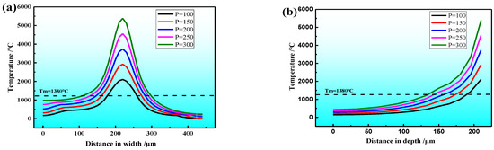Variation of molten pool width and depth under different laser powers: (a) width direction, (b) depth direction.
