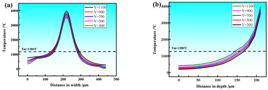 Figure 10 shows the variations in the depth and width of the molten pool under different scanning speeds. By comparing Figure 10 with Figure 9, it can be intuitively found that the influence of scanning speed on the size and temperature of the molten pool is slightly less than that of laser power.