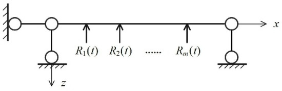 For a continuous beam with intermediate supports, we can simplify the analysis by replacing the supports with corresponding constraint reactions (R1, R2, …, Rₘ), as shown in Figure 1. So, the free vibration problem of the multi-span continuous beam is transformed into a forced vibration problem of a single simply-supported beam subjected to m unknown external forces [20].