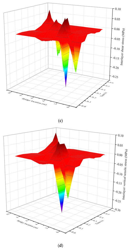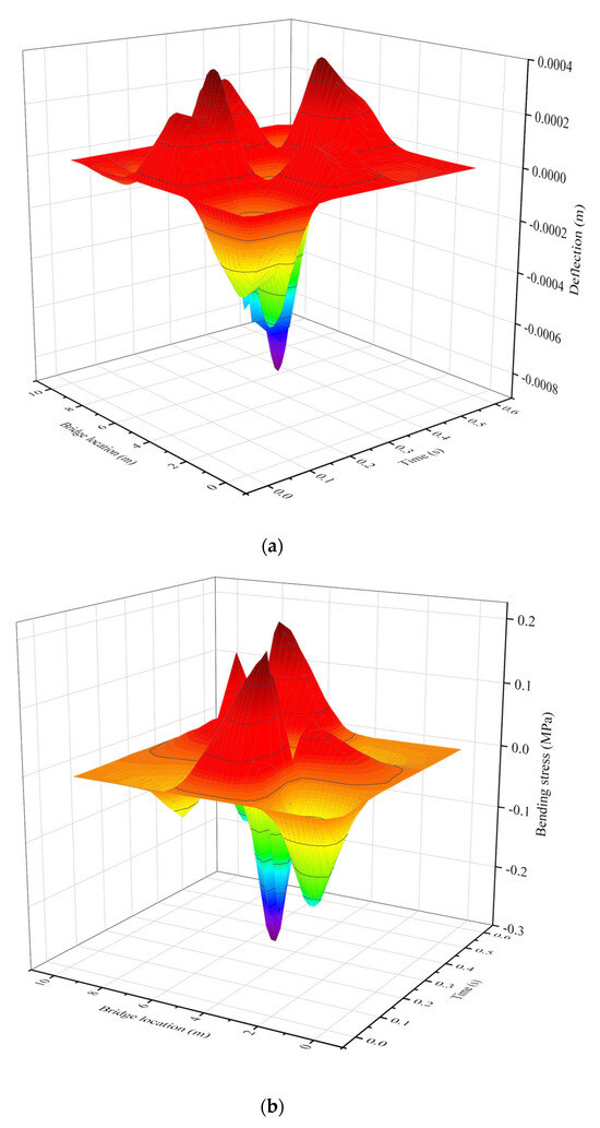 In summary, the analytical formulas demonstrate outstanding accuracy in predicting the full set of key response indicators—including deflection, bending stress, and interfacial shear/vertical tensile stresses. This provides designers with a unified and efficient tool, enabling rapid and comprehensive dynamic response assessment without relying on computationally expensive finite element simulations. However, this study has the following limitations: a. There is a lack of experimental validation. b. The impact of the natural factors (such as temperature and moisture) and even coupling factors on dynamic response can be considered in future work. c. It is necessary to establish finite element results based on relevant orthotropic steel bridge deck pavement models to modify the analytical calculation results derived from simplified models, with the aim of acquiring the dynamic response of steel deck pavement more accurately.