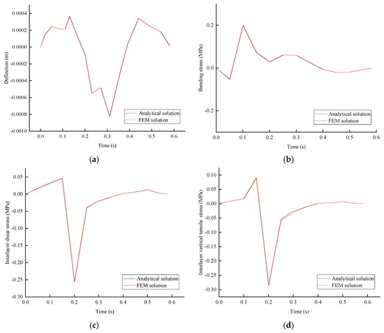 The deflection at mid-span of the second span, bending stress, UHPC-SMA interlayer shear, and vertical tensile stress at the beginning of the second span were calculated using analytical formulations and composite beam finite element modeling. The comparative results are presented in Figure 6. It shows that the analytical solution result of dynamic response derived in this paper is close to the result computed by the finite element solution, indicating that the derived analytical calculation formula of dynamic response is accurate and reliable.