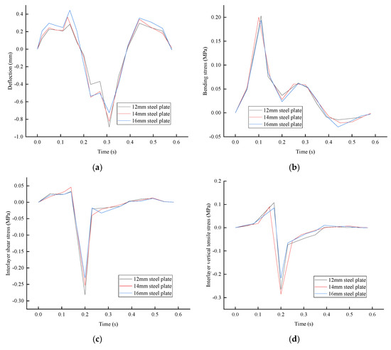 Dynamic response calculated with different steel plate thicknesses: (a) deflection; (b) bending stress; (c) UHPC-SMA interlayer shear stress; (d) UHPC-SMA interlayer vertical tensile stress.