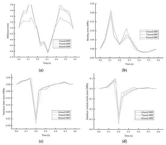 Dynamic response calculated with different UHPC thicknesses: (a) deflection; (b) bending stress; (c) UHPC-SMA interlayer shear stress; (d) UHPC-SMA interlayer vertical tensile stress.