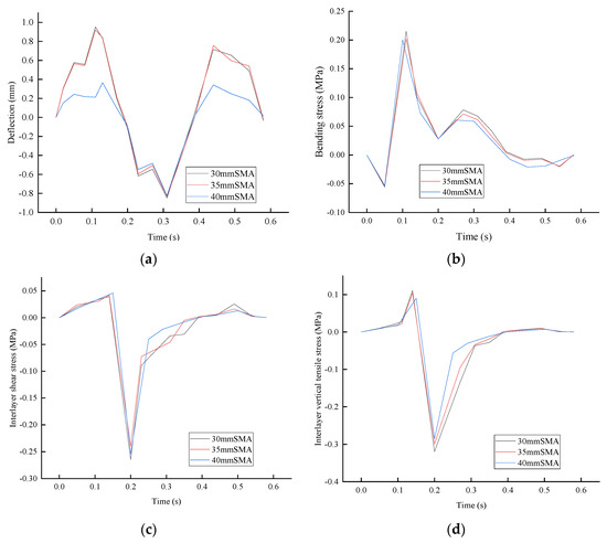 Three SMA thicknesses (30 mm, 35 mm, and 40 mm) were selected to calculate the dynamic responses under various working conditions using analytical formulas. The time-history curves of dynamic responses for each indicator are illustrated in Figure 9, and the peak values under different conditions are shown in Table 6.