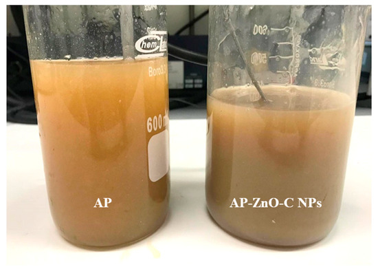 Views of film-forming solutions based on apple pectin (AP) without and with incorporation of zinc oxide commercial nanoparticles (AP-ZnO-C NPs).