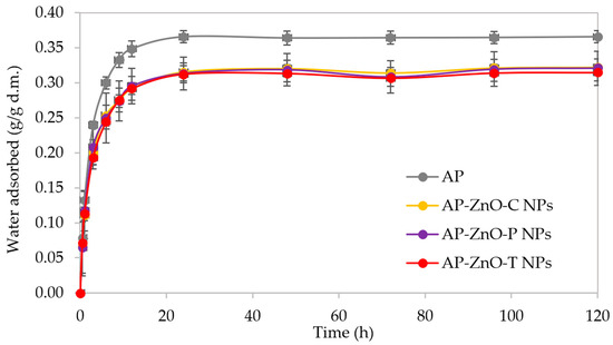 An even better understanding of the interaction of films with water particles can be gained by studying their sorption properties [60,61]. The water vapour kinetics and water vapour sorption isotherms allow us to determine whether and at what moisture content the zinc oxide nanoparticles cause higher water absorption and, thus, barrier properties of the films. The kinetic curves for the tested films are shown in Figure 4. The largest increases in film water vapour were obtained within the first 20 h of measurement, a characteristic phenomenon during adsorption. This is because, initially, water adsorbs on the top layer of the film and then in the deeper layers of the film. The process decreases over time by increasing the film’s water content and reaching equilibrium (constant values of adsorbed water content). When thermodynamic equilibrium is reached, the kinetics (and also the water content) remain constant. Through water saturation, the spaces between polysaccharides in the film decrease and thus, the kinetics of water vapour adsorption decrease [62]. An analogous phenomenon is observed in the study by Rivera-Hernández et al. [63] for the water vapour sorption kinetics of pectin/gelate films and in the study by Ciurzyńska et al. [64] evaluating the sorption of freeze-dried strawberries.