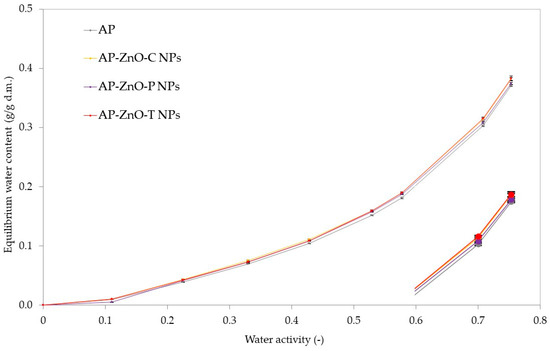 Figure 5 shows the results of water vapour sorption isotherms for pectin films, which show a similar pattern for all the variants tested. All curves showed a sigmoidal shape characteristic of most food products [65]. The initial water content was the same for all tested sample variants except for the film with zinc oxide nanoparticles created with passion fruit extract from passion fruit, which was slightly lower. Then, at the initial water activities of 0.15 to 0.5, the equilibrium water content was similar for each sample from the range 0–0.15 g/g d.m. and the values increased linearly up to 0.38 g/g d.m. at higher water activity of 0.5–0.75.