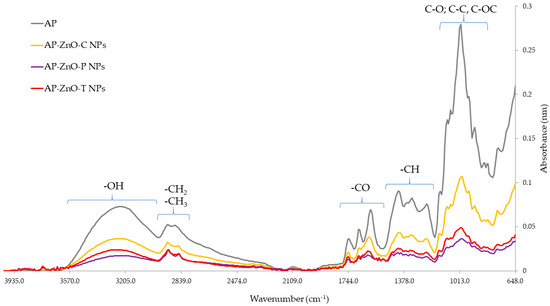 Fourier transform infrared (FT-IR) spectra of apple pectin (AP) enriched with commercial zinc oxide nanoparticles (AP-ZnO-C NPs) and those obtained from green biosynthesis using passion fruit extract (AP-ZnO-P NPs) and tomato extract (AP-ZnO-T NPs).