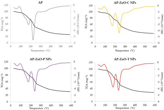 Thermogravimetric analysis (TGA) (black) and derivative thermogravimetry (dTG) (coloured) curves of films based on apple pectin (AP) enriched with commercial zinc oxide nanoparticles (AP-ZnO-C NPs) and those obtained from green biosynthesis using passion fruit extract (AP-ZnO-P NPs) and tomato extract (AP-ZnO-T NPs).