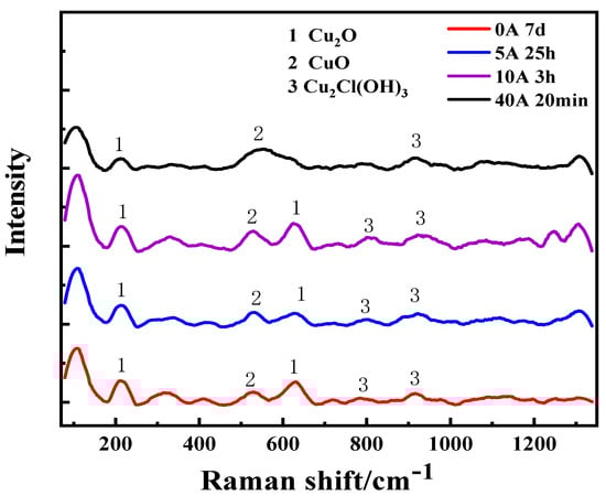 The Raman spectra of the surface corrosion products of Cu immersed in a simulated atmospheric environment with different currents are shown in Figure 2. The results of Raman spectroscopy analysis showed that the corrosion products were Cu2O, CuO, and Cu2Cl(OH)3. The color of Cu2Cl(OH)3 is green, which is similar to the results of macroscopic morphology observation. When the applied current is 0 A, 5 A, and 10 A, the corrosion products are mainly CuO, Cu2O, and Cu2Cl(OH)3. When the applied current increases to 40 A, the number of Raman characteristic peaks of Cu corrosion products decreases.