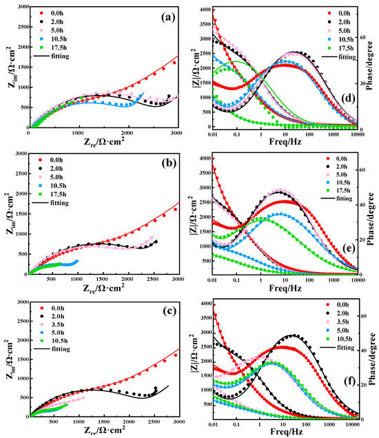 EIS of Cu being immersed in 3.5 wt% NaCl solution with different current field conditions and periods: (a,d) 0 A; (b,e) 5 A; (c,f) and 10 A.