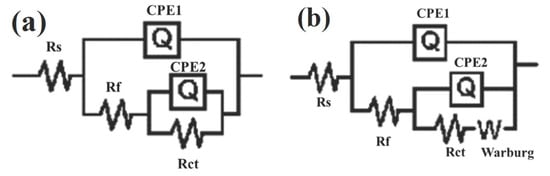 Equivalent circuit diagram for electrochemical impedance spectrum fitting of Cu. (a) 0 h; (b) Other conditions.