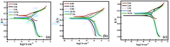 Polarization curves of Cu immersed in 3.5 wt% NaCl solution with different current field conditions and periods. (a) 0 A; (b) 5 A; (c) and 10 A.