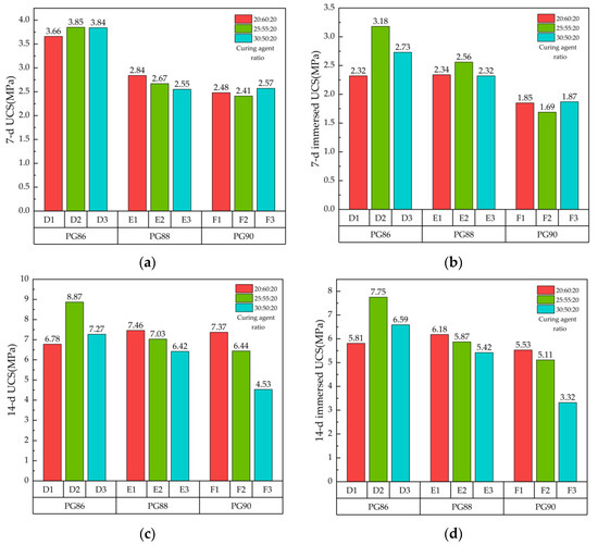 18] reported that incorporating calcined phosphogypsum (CPG) is conducive to forming gel structure that stabilizes the phosphogypsum. Meanwhile, the addition of lime underpins the early strength by neutralizing the water-soluble phosphorus contained in phosphogypsum. As a result, these researchers leaned on CPG and lime as curing agents to stabilize phosphogypsum for preparing road base materials. The experiments revealed that, in the case of a 7%–9% content of calcined phosphogypsum, the mechanical properties of the materials were desirable. The field cores extracted from the paved CPG-lime stabilized phosphogypsum base were experimentally observed to possess a 7-d UCS as high as 3.69 MPa. Regarding material ratio optimization, the lime–fly ash-phosphogypsum ternary system proposed by Wu et al. [