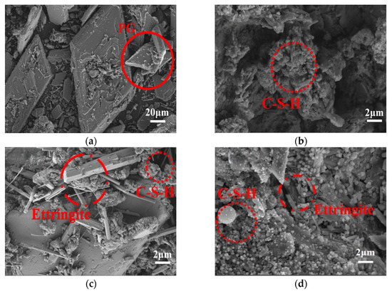 22] scrutinized the mechanical properties of lime to ground granulated blast-furnace slag (GGBS) solidified and stabilized phosphogypsum/soil mixtures. In contrast to the stabilized samples free from phosphogypsum, the strength and dynamic elastic modulus of samples mixed with phosphogypsum were dramatically elevated. The best stabilization of phosphogypsum was attained at a 1:9 ratio of lime to ground granulated blast-furnace slag. The compressive and flexural strength (UCS) of the stabilized PG reached 5–6 MPa at 14-d, a strength enhancement from 174.36% to 239.49%. This study clarified the mechanism of phosphogypsum in this system, which activates the hydration activity of lime and granulated blast furnace slag, while motivating the formation of ettringite and C-S-H gel. Yan Zhao’s team [