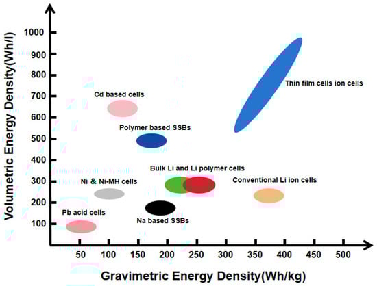 Relationship diagram between volumetric energy density and gravimetric energy density of various types of cells [7].