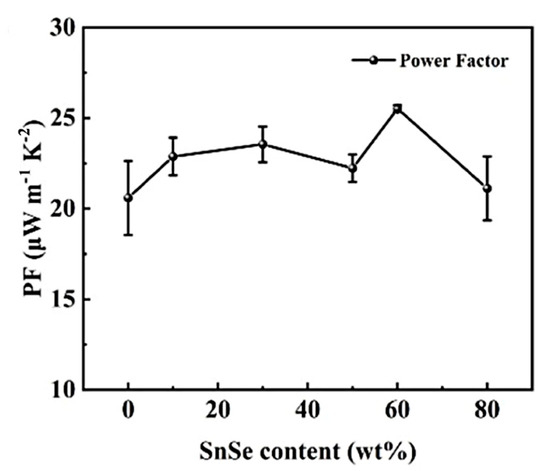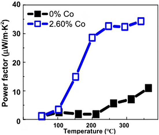 In 2020, Liu S et al. [21] prepared Co-doped SnSe thin films during the deposition of vacuum thermal evaporation on single-crystal Al2O3 substrates, to tune the nanosheet surface morphology. At 300 °C, the Co-doping amount is 2.60%, and the Co-doped SnSe thin film has the highest PF, which is 32.32 μWm−1K−2, as shown in Figure 2. This study presented a method to fabricate polycrystalline SnSe thin films with smooth surface morphology and also improved PF.