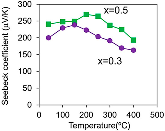 In 2024, Yamaguchi K et al. [37] prepared doped SnSe thin films on SrTiO3 single-crystal substrates by PLD. The researchers found that the maximum Seebeck coefficients were 254 μV/K at x = 0.3 and 150 °C and 288 μV/K at x = 0.5 and 250 °C, which were lower than those of the SnSe thin films (550−620 μV/K), as shown in Figure 8. This is reasonable because a high carrier concentration results in a low Seebeck coefficient. Despite the trade-off between electrical conductivity and the Seebeck coefficient, the PF was improved with an increasing Te content. The thin film with x = 0.5 had the highest PF among the Sn (Se, Te) films (x = 0−0.5). The PF of the present Sn (Se, Te) films was 0.17 μW·cm−1·K−2 at room temperature and 1.1 μW·cm−1·K−2 at 300 °C.