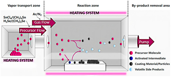 CVD, as a mature thin-film preparation technology, is widely used in the preparation of SnSe thin films due to its precise and controllable composition, dense structure, and good adhesion to substrates. The basic process of CVD, illustrated in Figure 9, mainly consists of three steps: the vapor transport zone, the reaction zone, and the by-product removal area. In the process of preparing SnSe thin films by CVD, the precursor flow includes a Sn precursor and a Se precursor. It needs to be mixed with carrier gas (Ar/N2) and enter the system through the vapor transport zone. CVD has high controllability and scalability and can prepare thin films with good uniformity over a large area. In addition, it has strong adjustability for the thickness, morphology, and crystal structure of the thin film.