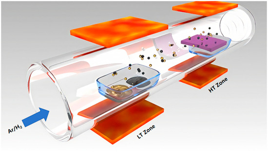 Dual-temperature-zone CVD is a thin film preparation technique that achieves material-oriented growth and component control by precisely controlling the temperature in different regions. The core of this method is to divide the reaction system into two independent temperature zones, a high-temperature source zone (HT Zone) and a low-temperature deposition zone (LT Zone), as illustrated in Figure 10, and drive the directional transport and controllable deposition of gas-phase precursors through temperature differences. Heating the precursor into gaseous reactants occurs in the HT Zone; gaseous substances are transported to the substrate surface in the LT Zone to prepare the required thin film materials. What is more, heating the precursor into gaseous reactants is a necessary step for dual-temperature-zone CVD. It not only heats the precursor into gaseous reactants but also promotes chemical reactions in the subsequent deposition process through the HT environment. Therefore, both PVD and CVD involve “gas-phase transport”, but PVD is the direct transport of physical phase transition, while CVD is the transport and driving of chemical reactions. This is the core distinguishing factor between the two.