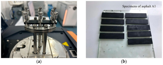 DMA Q800 (TA Instruments, New Castle, DE, USA) was used to investigate the phase transition characteristics of the asphalt binders. Testing was conducted using a dual-cantilever clamp with asphalt binder specimens prepared in thin sheets measuring 60 mm in length, 13 mm in width, and 3 mm in thickness (L60 mm × W13 mm × D3 mm). The dual-cantilever clamp and asphalt binder samples are illustrated in Figure 1. The temperature spectrum of the dynamic mechanical parameters of the asphalt binder was obtained using a temperature scanning mode with a fixed frequency, strain, and heating rate. The test conditions are listed in Table 2.