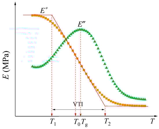 where and are the maximum and minimum moduli, respectively, MPa; x0 and dx are the shape parameters of the curve. x0 is the parameter that represents the inflection point temperature of the sigmoidal curve, °C; dx is the parameter that controls the steepness (slope) of the viscoelastic states, °C.