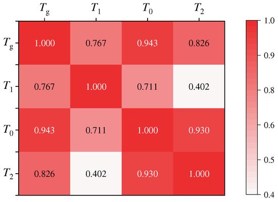 The significance of differences and correlations between the PTTs were assessed using Pearson correlation analysis, and the results are presented in Figure 3. The Pearson correlation analysis demonstrated the strength of the linear relationships and their statistical significance among the variables. With the exception of a smaller correlation coefficient of 0.402 between T1 and T2, the correlation coefficients (r) between all other variables exceeded 0.7. All were statistically significant at the 1% level (p < 0.001), indicating strong positive correlations. Therefore, this study evaluates the low-temperature performance of asphalt binder using Tg as the indicator; a smaller Tg value indicates better low-temperature performance.