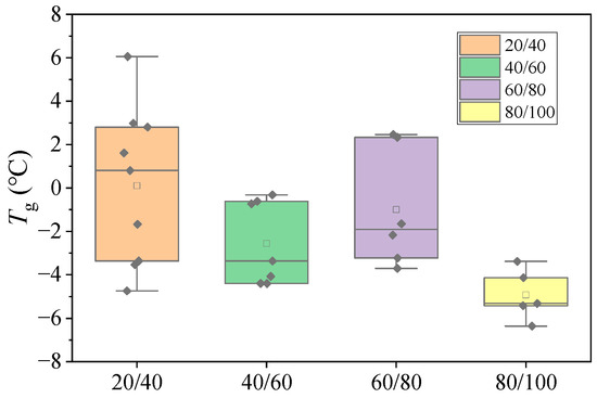 The ranges of the Tg indicators for the 30 asphalt binder types studied, classified by penetration grade, are illustrated in Figure 4. The Tg spans for 20/40, 40/60, 60/80, and 80/100 penetration-grade asphalt binders are −4.7 °C to 6.1 °C, −4.4 °C to −0.3 °C, −3.7 °C to 2.5 °C, and −6.4 °C to −3.4 °C, respectively. The results indicate a significant variation in Tg values among asphalt binders of the same penetration grade, and the expected trend of lower penetration grades correlating with higher Tg values was not observed. Furthermore, the conventional penetration-grade evaluation system primarily relies on ductility values to assess the low-temperature performance. However, ductility, as an empirical indicator, fails to differentiate low-temperature performance when ductility exceeds 100 cm or when brittle fracture occurs. This highlights the limitations of the current grading framework for evaluating asphalt binder behavior under low-temperature conditions.