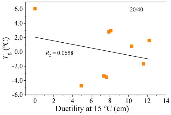 Relationship between Tg and ductility (15 °C) of 20/40 asphalt binders.