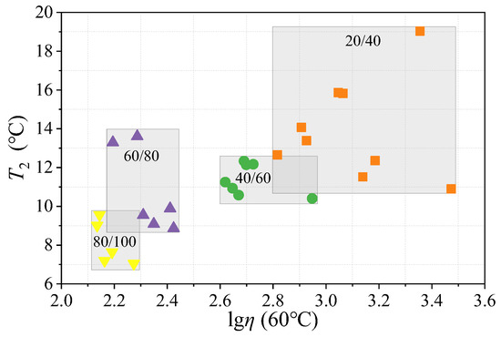 PTT (T2), also referred to as the flow transition temperature, signifies the temperature at which an asphalt binder transitions from a viscoelastic state to a viscous flow state. An elevated T2 indicates superior high-temperature performance of the asphalt binder. A comparison between the T2 metric and the conventional high-temperature indicator viscosity (η) is shown in Figure 6. The analysis reveals overlapping numerical ranges of T2 and η across asphalt binders of varying penetration grades, diverging from the expected trend of decreasing values with increased penetration. Moreover, higher viscosity does not necessarily correlate with elevated T2 values. For instance, 20/30-grade asphalt binder E1, which demonstrated the highest viscosity in this study, possesses the lowest T2 value within its grade, which was even lower than that of certain 40/60-grade asphalt binders. Similarly, among the 60/80-grade asphalt binders, F2 and F3 exhibit viscosity values that are lower than those of the 90-grade asphalt binders, yet their T2 values exceed those of the 40/60-grade asphalt binders. Viscosity quantifies the resistance of asphalt binder to flow, reflecting its flow behavior at specific temperatures, whereas the flow transition temperature T2 denotes the critical temperature at which viscosity markedly decreases. The proper interpretation and application of these two metrics offers vital guidance for material selection and engineering practices.