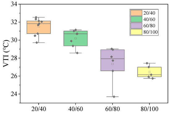 The viscoelastic temperature interval (VTI) between the PTTs (T1 and T2) is characterized by asphalt binders existing in a viscoelastic state. During this phase, the asphalt binders display a certain degree of deformation resistance and elastic recovery capability. This viscoelastic temperature range can be considered the optimal service temperature range for asphalt binders; a broader temperature range signifies enhanced performance, with improved low-temperature crack resistance and high-temperature rutting resistance. As illustrated in Figure 7, the viscoelastic state temperature interval for base asphalt binders ranges from 23 °C to 33 °C. Within the same penetration grade, variations in the VTI of asphalt binders are observed, with the 60/80-grade asphalt binders showing particularly significant dispersion. Nevertheless, the overall trend indicates that the VTI of the asphalt binders decreases as the penetration grade increases. When selecting an asphalt binder grade, it is crucial to assess its viscoelastic temperature range to ensure a wider operational temperature service range is obtained, allowing for adaptability to fluctuations in pavement temperature environments.