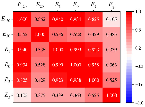 The modulus serves as a parameter reflecting the mechanical response of materials under specific conditions, wherein characteristic modulus values across varying temperature ranges reveal the macroscopic properties of the materials. The study commenced with a correlation analysis of the characteristic moduli, and the results are detailed in Figure 8. Parameters E1, E0, and E2 correspond to characteristic moduli linked to PTTs derived from complex modulus curves, exhibiting correlation coefficients exceeding 0.92, indicating significant linear relationships among them. Parameters T1, T0, and Tg are utilized to evaluate the low-temperature performance of asphalt binders; however, the corresponding moduli E1, E0, and Eg demonstrate correlation coefficients below 0.37, suggesting a lack of correlation. Notably, the low-temperature modulus E−20 at −20 °C reveals strong correlations with E1 and E0 (r > 0.93) but shows no linear relationship with Eg (r = 0.105). Similarly, the high-temperature modulus, E20 at 20 °C, displays minimal correlation with E2 (r < 0.43). This is primarily due to the fact that the characteristic moduli correspond to different temperature benchmarks, complicating the comparison of modulus variations across various asphalt materials.