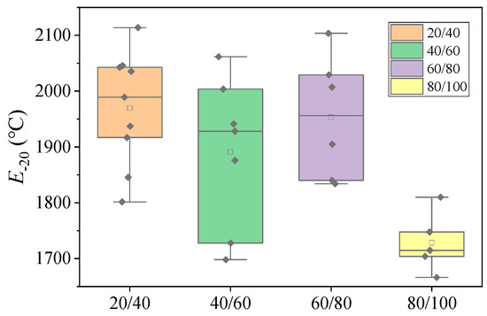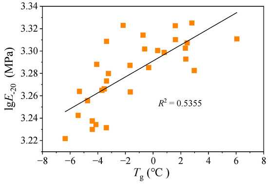 Figure 9 compares the low-temperature moduli range of the neat asphalt binders analyzed in this study. The results reveal significant variability in the low-temperature characteristic moduli within the same penetration grade, whereas the modulus values for the 20/40-, 40/60-, and 60/80-grade asphalt binders reside within similar numerical ranges. This finding indicates that there is no direct correlation between the low-temperature modulus and the penetration grade of asphalt binders (e.g., 20/40), with low-penetration-grade binders not necessarily exhibiting higher E−20 values than higher-grade asphalt binders (e.g., 60/80). From a modulus perspective, lower-grade asphalt binders may not have an inferior low-temperature performance. Figure 10 illustrates the correlation between the Tg of an asphalt binder and E−20. While PTT and characteristic modulus show some association with low-temperature performance (R2 = 0.5355), their correlation remains relatively weak. Practical engineering applications should therefore implement quality control by considering both PTT and modulus parameters to optimize the low-temperature performance of asphalt binders.