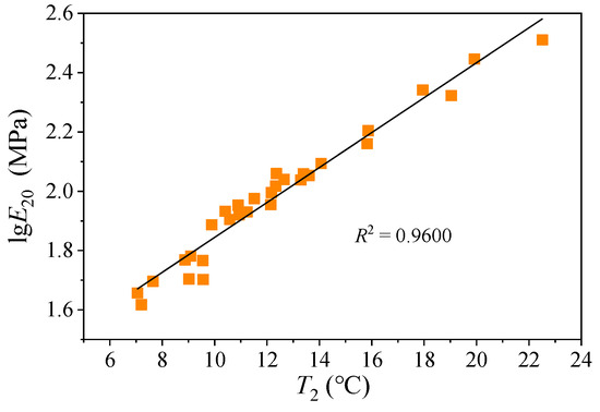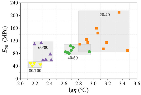 A comparison between the E2 indicator and conventional high-temperature parameter η is shown in Figure 11. The results indicate a general correlation between the modulus values and asphalt binder penetration grades, with higher penetration grades typically exhibiting lower modulus values. However, the overlapping ranges between E20 and η suggest that high-viscosity asphalt binders do not necessarily correspond to elevated E20 values. The E20 indicator is closely aligned with the T2 evaluation results presented in Figure 6. Figure 12 shows the relationship between asphalt binder’s T2 and log E20, revealing a strong linear correlation (R2 = 0.96). This confirms a solid association between PTT and the characteristic modulus in assessing the high-temperature performance of asphalt binders, with consistent evaluation results. For practical engineering applications, either PTT or modulus parameters can be selected for the quality control of asphalt binders’ high-temperature performance.