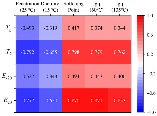 Under the penetration grading system, asphalt binder performance is primarily assessed through penetration, softening point, ductility, and viscosity. Typically, asphalt binders with lower penetration, a higher softening point, and greater viscosity demonstrate superior high-temperature performance. Within the same penetration grade, higher ductility correlates with improved low-temperature performance. However, evaluations based on the phase transition characteristic temperatures and modulus values reveal significant variations in the high- and low-temperature performance among asphalt binders with identical penetration grades. The penetration grading system does not limit phase transition-based evaluations; lower-grade asphalt binders may not necessarily exhibit better high-temperature performance or poorer low-temperature performance than their higher-grade counterparts. Correlation analyses were conducted for the representative low-temperature indicators (Tg and E−20) and high-temperature indicators (T2 and E20), and the results are summarized in Figure 13.