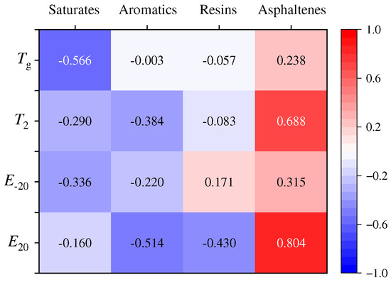 For the low-temperature characteristic modulus E−20, no statistically significant correlations with any of the four components are identified at the 0.05 significance level (|r| < 0.34). In contrast, the high-temperature characteristic modulus E20 shows significant correlation with aromatics and asphaltenes at the 0.01 level. Specifically, E20 exhibits a weak negative correlation with aromatics (r = −0.514) and a strong positive linear correlation with asphaltenes (r = 0.804). No significant relationships are observed between E20 and saturates or resins.