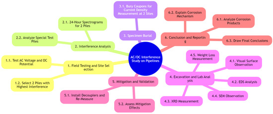Over the past five years, research on DC interference sources has primarily focused on interference from DC rail traffic and high-voltage DC (HVDC) facilities. Du [4] studied the corrosion behavior of buried pipelines and the correlation between corrosion rates and dynamic DC rail traffic using laboratory simulations and on-site specimen tests. The results shows that the majority of fluctuation periods of interference from DC rail traffic were 50–200 s in China. The dynamic cycle significantly affected the corrosion rate. Feng [5] developed a measurement device to record pipe/ground potential, surface potential gradient, and current located in the vicinity of the Fujin Road station of Shanghai Metro Line 1. The results shows that over-protection and under-protection had occurred, requiring drain management. Peng [6] conducted an analysis for the interference mechanism of DC rail traffic on one pipeline using an in situ monitoring method. In recent years, with the widespread application of HVDC facilities, the interference caused by HVDC systems has increasingly drawn attention. Zhang [7] focused on the variation of DC interference parameters and the corrosion behavior of X80 steel subjected to a 100 V DC potential in Guangdong real soil with five different water contents using simulation experiments. The results shows that there were obvious differences in the current density changes of X80 specimens in various soil conditions with varying contents of water under interference of 100 V DC potential. Xu [8,9] studied the interference of buried pipelines from HVDC grounding electrodes and the corrosion behavior of X80 steel in clay soil with different water contents under HVDC interference.