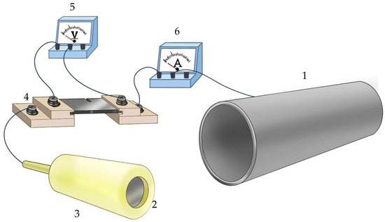 The measurement method of AC and DC current density. 1. Test pipeline. 2. Test piece at the in situ measurement point. 3. Epoxy resin. 4. A shunt or standard resistor. 5. Voltmeter. 6. Ammeter.