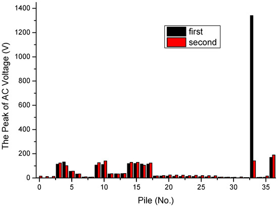 - At Pile 33, the maximum AC interference voltage between the pipeline and the steel electrode was 1341.8 V in the first measurement. However, the peak value obtained from the second measurement at pile 33 decreased from 1341.8 V to 143.7 V, indicating that the 1341.8 V may be caused by a sudden grounding of the electrode, while the 143.7 V may be caused by the induced voltage. Meanwhile, at Pile 7, the most negative DC interference potential between the pipeline and the copper/copper sulphate reference electrode was −11.946 V. At Pile 3, the most positive DC interference potential between the pipeline and the copper/copper sulphate reference electrode was 4.862 V in the second measurement.
