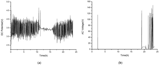 Figure 7a shows the DC time series mapping of Pile 4. The pipeline potential was negative, and it has essentially been concluded that the vicinity of test Pile 4 was the inflow point of DC current. From 0 h to 10 h, the DC potential of the pipeline oscillated and jumped between −1.0 V and −0.6 V. From 11 h to 16 h, the potential of the pipeline maintained near −0.65 V with less oscillations. From 16 h to 24 h, the pipeline again shows large oscillations and jumps. These variations are similar to those explained in Figure 6a and are related to the trains going up and down.