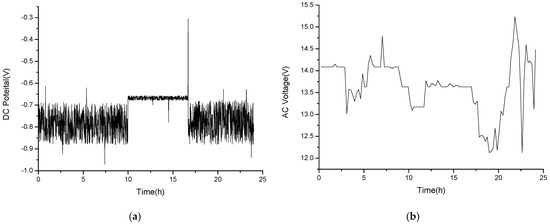 As illustrated in Figure 7b, the AC time series mapping of Pile 4 is shown. The AC voltage fluctuated within the range of 12 V and 15.5 V, and there was a continuous AC voltage for 24 h. The highest average value of AC interference was found in Figure 4. Above Pile 4, there was a high-voltage power line crossing through, which may be the reason for the larger average value of AC interference voltage in this particular pile.