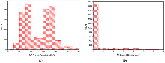 (a). Histogram of AC current density at Pile 4; (b) histogram of DC current density at Pile 4.
