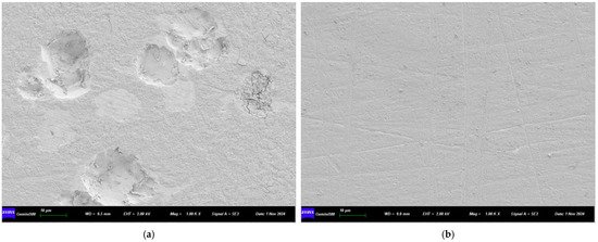 The surface condition of the test pieces was observed by SEM, as shown in Figure 10a,b, the surface condition of the test pieces was different. Figure 10a shows the surface condition of the test piece at Pile 3, with corrosion pits on the surface, and pitting corrosion may have occurred. Figure 10b shows the surface condition of the test piece at Pile 4. The surface was relatively flat. There was no corrosion pit, and almost no corrosion occurred.