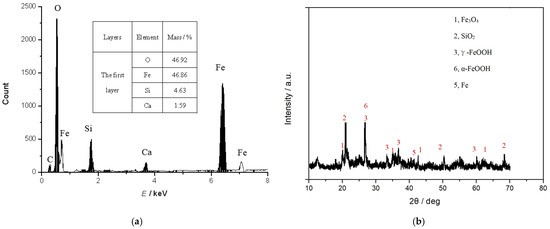 The EDS analysis results of the piece at Pile 3 were shown in Figure 11a. From Figure 11a, it can be seen that the outer product layer was mainly the oxide of Fe and contained a small amount of C, Si, Ca, etc.