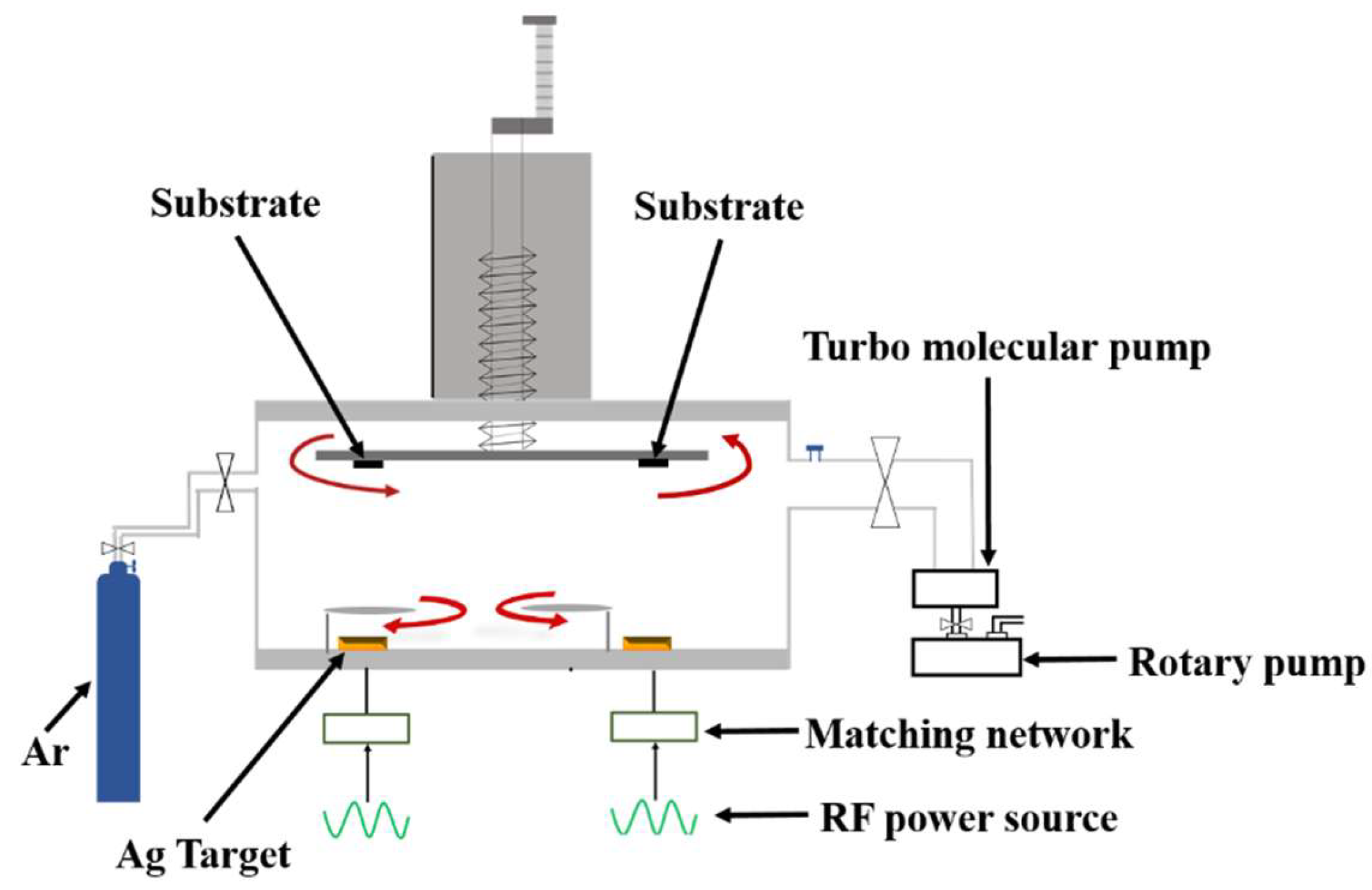 Among various deposition techniques, RF-MS is widely recognized as a versatile and efficient method for the fabrication of high-purity, high-uniformity metallic thin films. It offers several advantages, including low contamination, excellent adhesion, and precise controllability of deposition parameters. However, controlling the microstructural evolution of Ag films during RF-MS remains challenging, as it involves complex interactions between plasma characteristics and film growth dynamics.