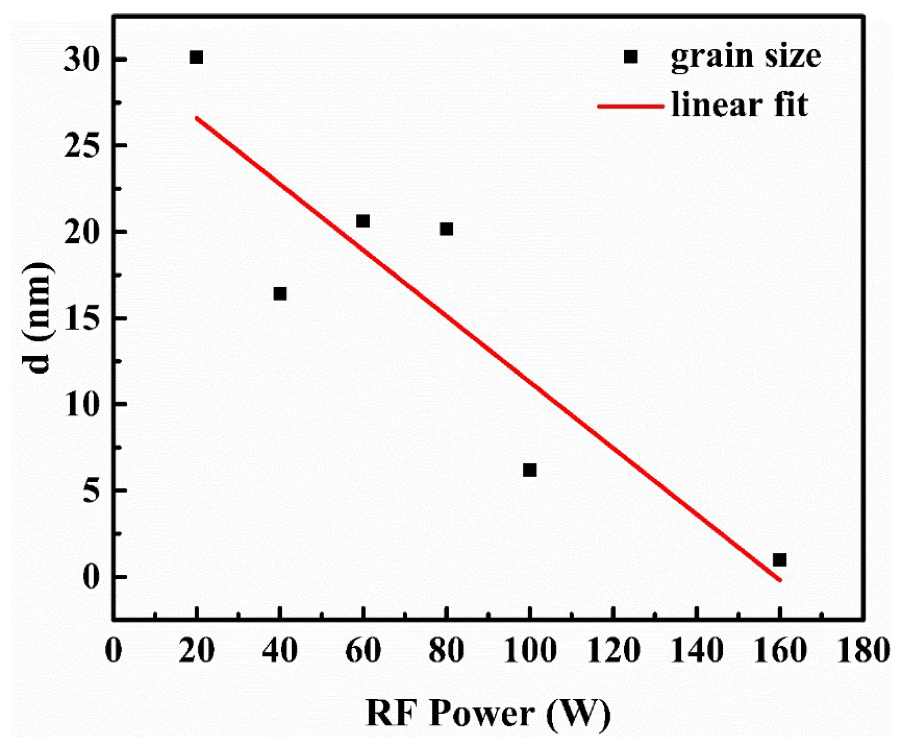 Figure 3. As seen from the fitting curve (red line), as the RF power increased from 20 W to 160 W, the coherent scattering region (CSR) size, calculated using the Scherrer formula, decreased from 30 nm to 2.5 nm, indicating a higher degree of crystallinity. However, the surface grain size observed in the SEM images increased with higher RF power, consistent with the larger atomic flux and enhanced adatom mobility at higher power. This may be attributed to the enhanced ion bombardment effect at higher RF power, which increases the nucleation rate while restricting grain growth. Previous studies have reported similar trends in the reduction of CSR size with increased RF power, which is linked to enhanced ion bombardment and improved adatom mobility during the sputtering process [